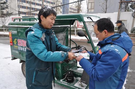 瑞雪兆丰年。1月中旬,一场大雪覆盖了整个河南渑池。雨雪天气里,道路湿滑难行,给百姓生活带来不便。尽管这样,渑池县邮政分公司的投递员们肩负着邮政普遍服务的职责,践行着“情系万家 信达天下”的使命,他们不畏严寒,在风雪中坚守岗位,将邮件和报刊送至千家万户。图为投递员姜波在风雪中投递,将包裹及时送交给收件人。  □田丹丹  摄影报道