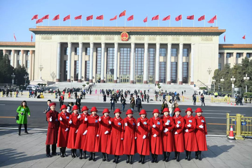 她们今天每个人都不约而同地选择了红色上衣,和人民大会堂、天安门广场上的红旗相互映衬,红色是今天的主题,这红是不断涌动的红,这红是希望的红。
