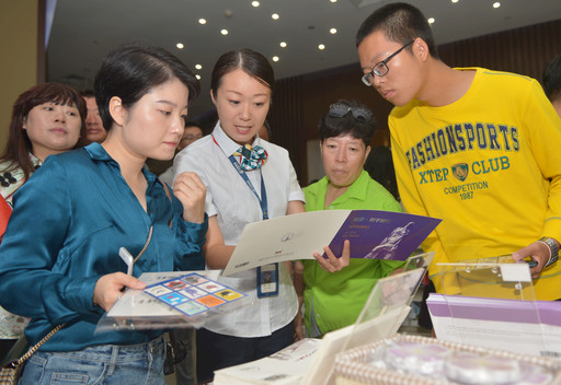 紫金草和平邮局员工为游客介绍邮品。