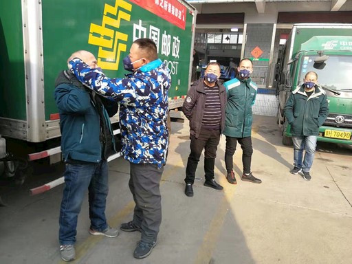 为保证一线员工安全生产,山西省忻州市邮政分公司工会第一时间为投递、网运一线员工发放了口罩,并使用消毒液对办公、生产场所充分消毒,做好一线防护工作。忻州市各县级邮政分公司也积极响应,为一线员工购买口罩,保证员工防护到位。图为忻州市分公司员工在出班前认真戴好口罩。 □张娟  摄影报道