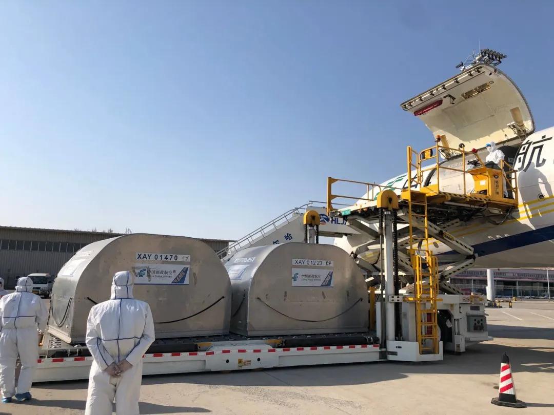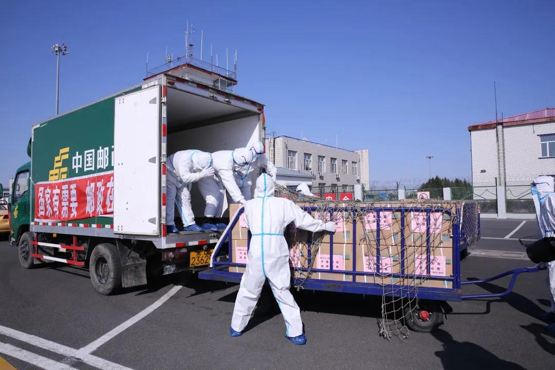 哈尔滨邮区中心局员工将邮航包机运抵的医用物资进行装车。