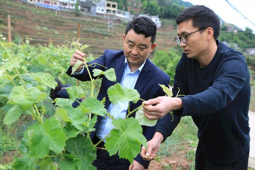 邮储银行贵州省毕节市分行今年协同毕节市邮政分公司,全力加强市级及以上专业合作社、家庭农场走访,以惠农项目为抓手,助力决胜脱贫攻坚。截至4月底,该分行已发放金融精准扶贫贷款近1.8亿元,其中发放个人精准扶贫贷款1400多万元,直接支持建档立卡贫困户175户。图为邮储银行毕节市七星关区支行负责人(左一)走访专业合作社查看葡萄长势。  □苏勇  摄影报道