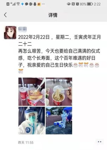 朋友圈里,他这样记录道:“2022.2.22在有爱的日子里,和抗疫一线的爱人并肩作战,期待生机勃勃的苏式生活早日归来!”