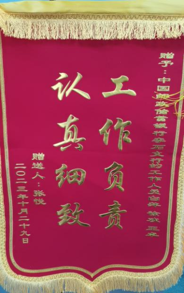 跨赛期间,一位客户拿着锦旗来到李石支局,“认真细致,工作负责”8个字,承载的是客户对邮政优质、热情服务的认可,更是对支局人员工作的肯定。