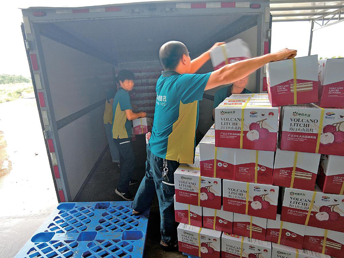 邮政工作人员正在将荔枝邮件搬运装车。□中国邮政报记者 黄文燕 摄