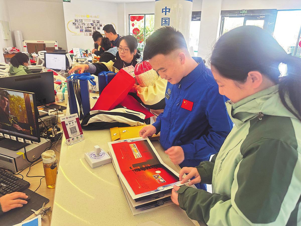 10月31日,搭载神舟二十一号载人飞船的长征二号F遥二十一运载火箭在甘肃酒泉卫星发射中心成功发射。为记录中国航天事业的辉煌成就,酒泉市邮政分公司推出“2025筑梦太空”系列邮品,既具有航天发射的纪念意义,又兼顾集邮爱好者关注的收藏价值,受到各界的欢迎。图为在酒泉航天主题邮局,客户们踊跃选购航天邮品。