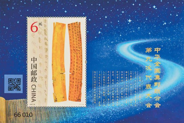 小型张图案表现了“黑夫木牍”。该木牍1975年出土于湖北省云梦县睡虎地4号秦墓,是目前考古发现的最早家书,延续了中华全国集邮联合会大会系列邮票以邮驿文化元素为表现内容的惯例。该家书由士兵黑夫与惊写给兄长衷,信中讲述了一些从军细节,还有对家人的关怀及衣物钱粮的需求。边饰背景中展开的竹简似一条时光长河,在象征中华文明的浩瀚星空里蜿蜒伸展,穿越千年、对话古今,蕴含了中华文明在传承中创新、在创新中发展的思想智慧。