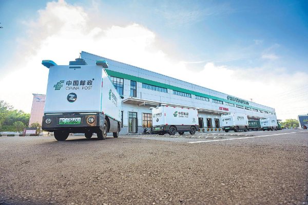 1月19日,在河南省淅川县寄递物流共配中心,邮政无人车满载邮件整装待发。 □刘力扬 摄